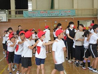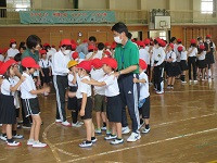 今日の昼休みに、青組はブロック長と副ブロック長の司会・進行で、ブロック結成式を行いました。仲良くなるために「言うこと一緒・やること一緒ゲーム」と「言うこと一緒・やること逆ゲーム」をしました。グループで手をつないで、言われた動作や反対の動作をして楽しく過ごしました。初めての青組の集まりで、団結の意識を高めました。