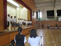 朝、松山市総合体育大会(水泳の部)の壮行会を行いました。運営委員会の司会で、全校児童でエールを送りました。また、うちわに張った全校からの応援メッセージを手渡しました。選手のみなさん堀江小学校の代表として頑張ってください。水泳総体は、7月22日(月)に行われます。自己ベストがでるよう応援しています。
