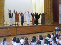 4校時は、「地球の上で生きる ~80か国で出会った人々~」の演題で中矢匡(なかやただし)先生による講演会を行いました。はじめにいろいろな国の民族衣装を着用した先生方が登場しました。それぞれの国の挨拶をして会が始まりました。中矢先生はカンボジアやインドで出会った子どもたちの様子を写真やビデオを交えてお話していただきました。地雷や戦争で家族をなくした子どもたちについて、1年生にもよく分かるように話していただきました。中矢先生は現在、ウクライナの子どもたちにおもちゃを送るボランティアを行っています。日本から送られたおもちゃをもらった子どもたちの笑顔がすてきでした。わたしたちも何かできることを考えてみたいですね。