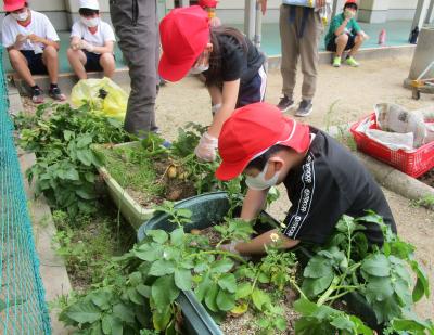 1月に畑とプランターに植えていたジャガイモの収穫をしました。茎をゆらゆら揺らしながら上手に抜けました。